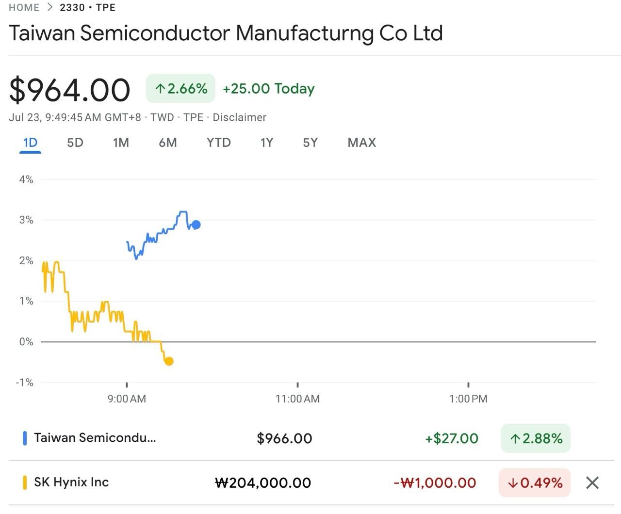 한국 반도체와 대만 반도체 주가 흐름