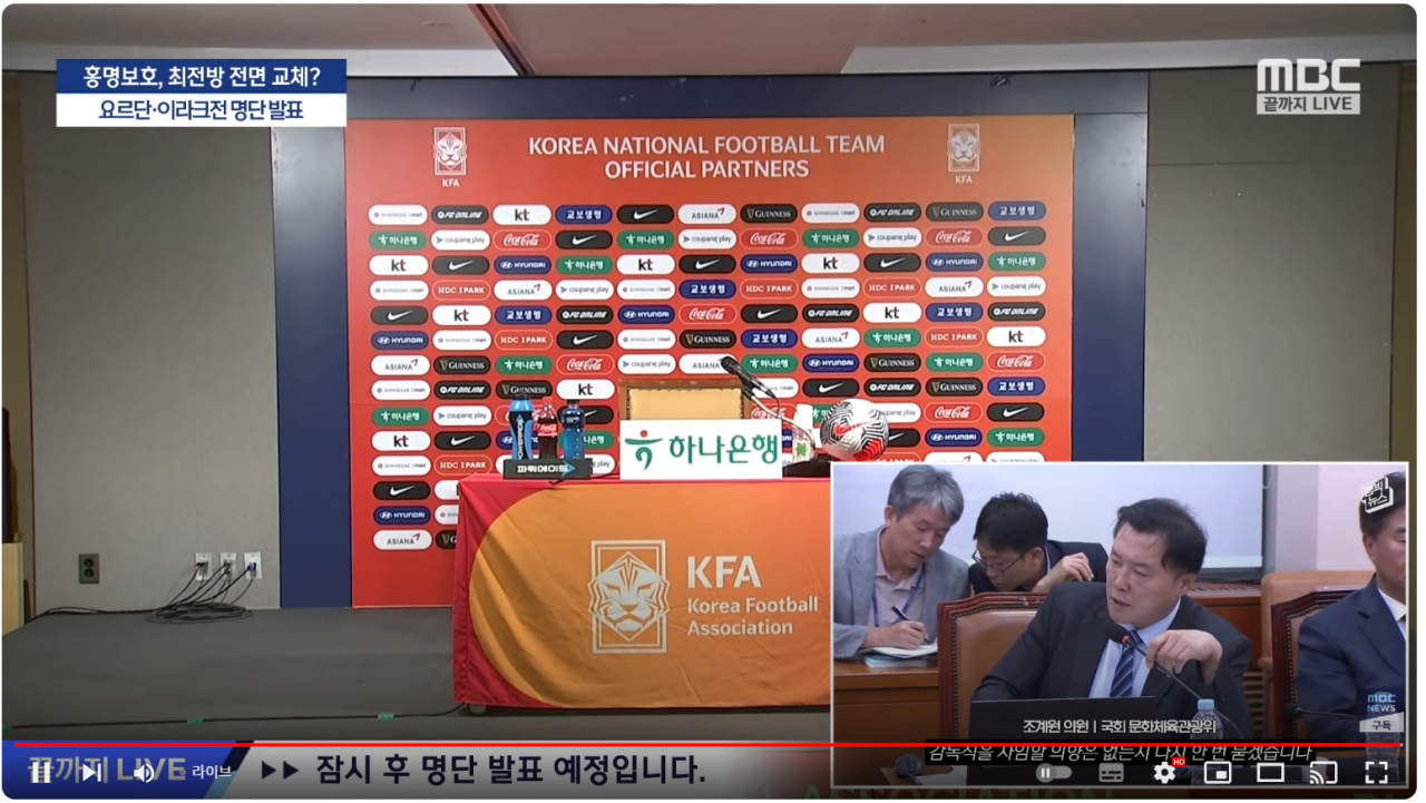 실시간 MBC뉴스 국대 명단 발표 회견 유튜브 중계 화면