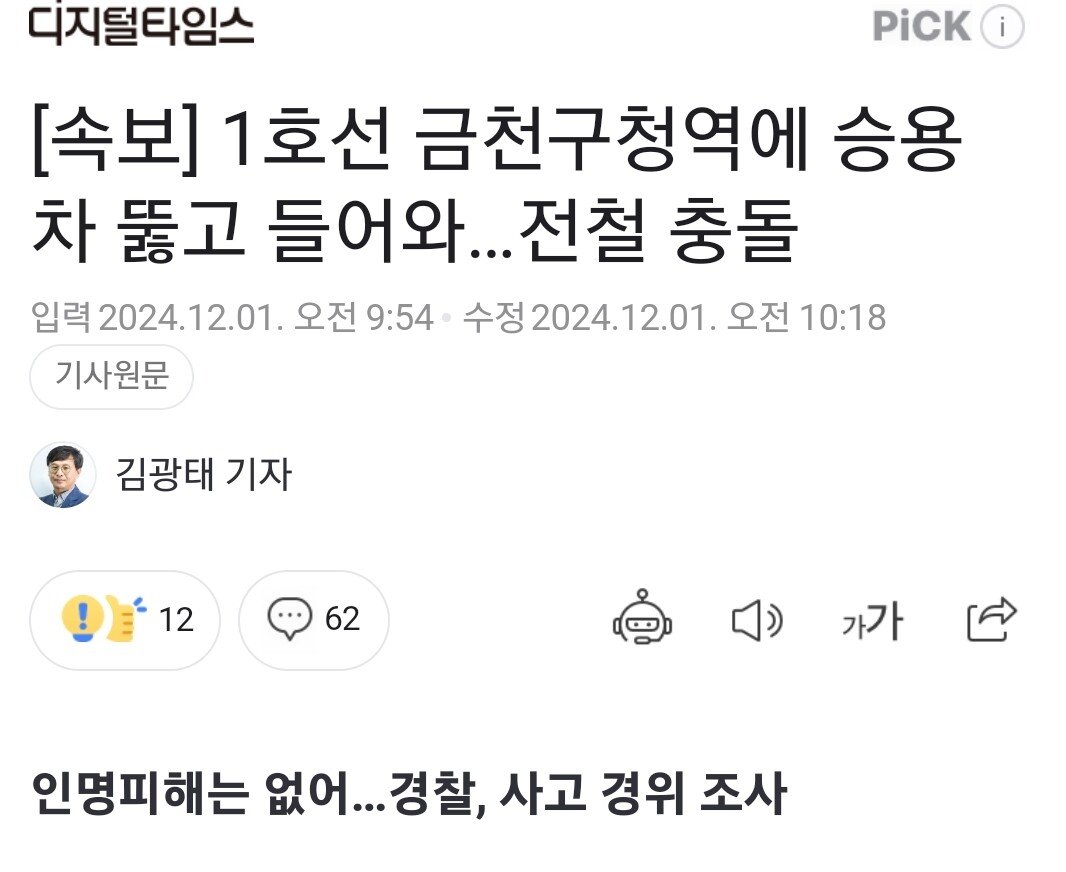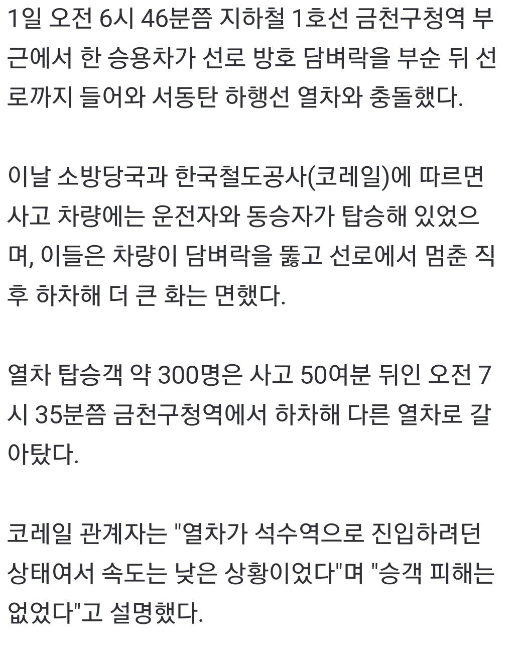 [속보] 1호선 금천구청역에 승용차 뚫고 들어와...전철 충돌