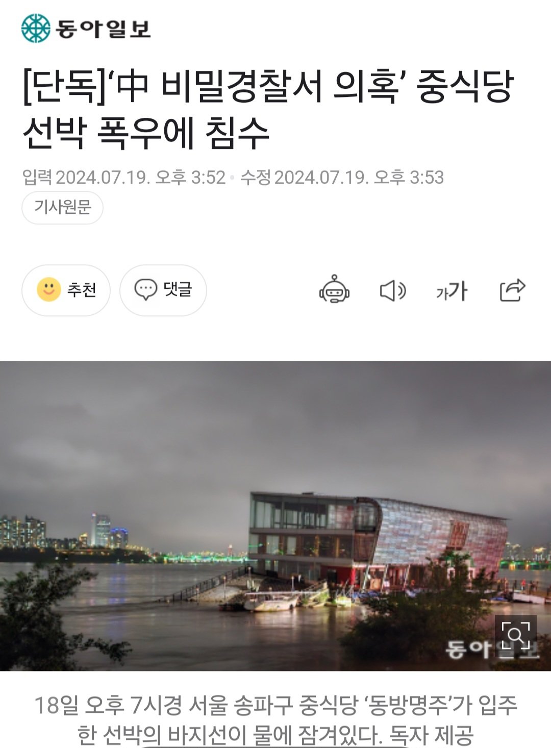 중국 비밀경찰서’ 의혹을 받는 서울 송파구의 중식당이 입주한 선박이 폭우로 불어난 강물에 침수돼 바지선이 가라앉고 직원들이 대피하는 등 소동이 빚어졌다.
