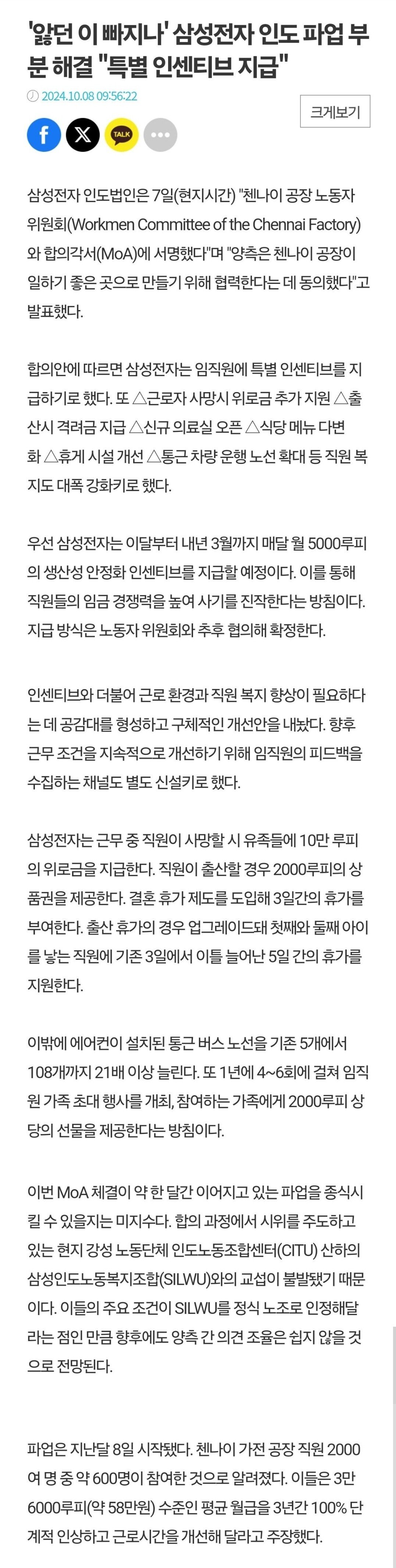 삼전 인도 공장 파업 타결...인센 15퍼 지급하기로 ㅋㅋㅋㅋ