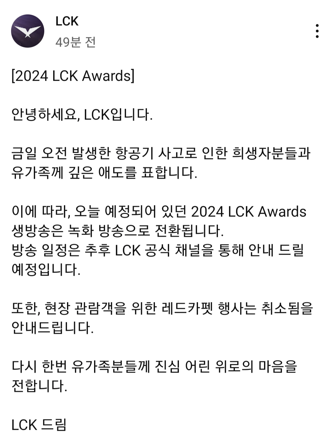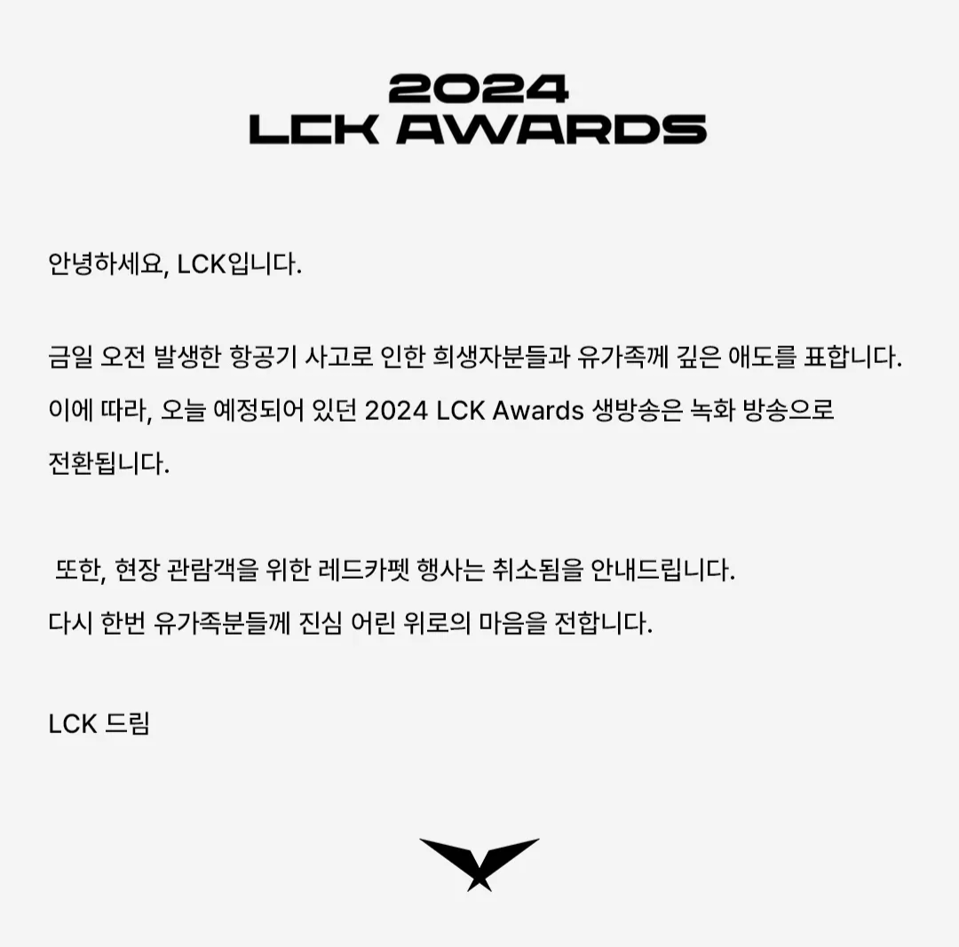 2024 LCK Awards 오늘(29일) 녹화 방송으로 전환