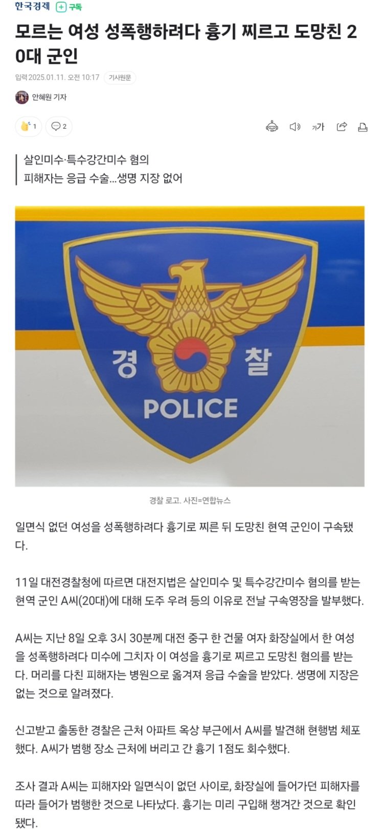 모르는 여성 성폭행하려다 흉기 찌르고 도망친 20대 군인