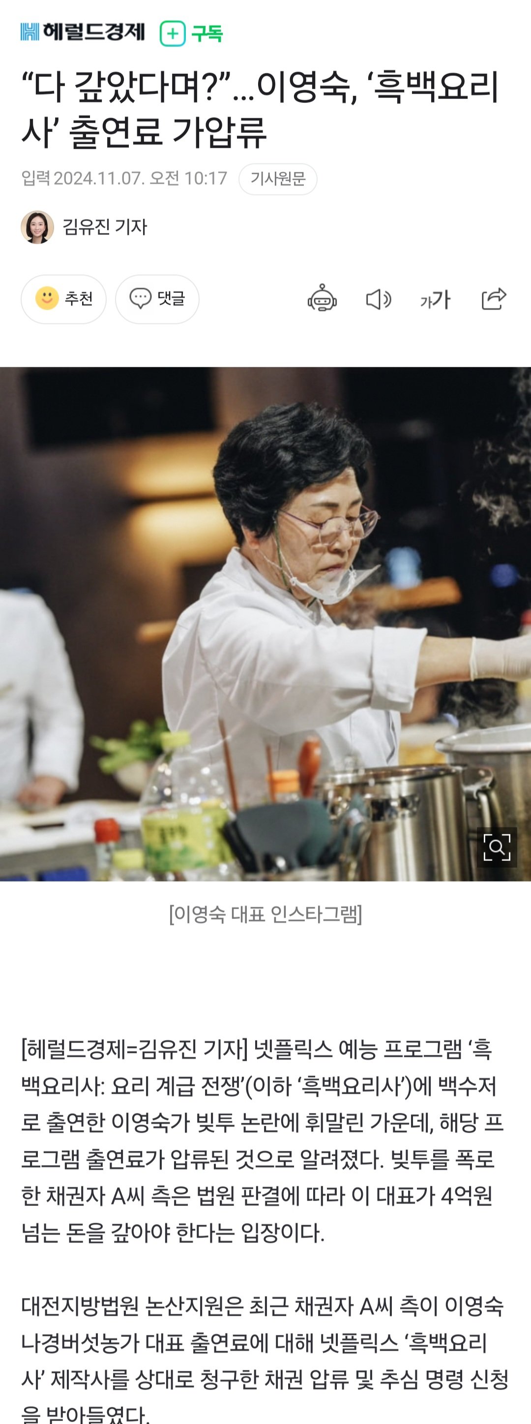 “다 갚았다며?”…이영숙, ‘흑백요리사’ 출연료 가압류