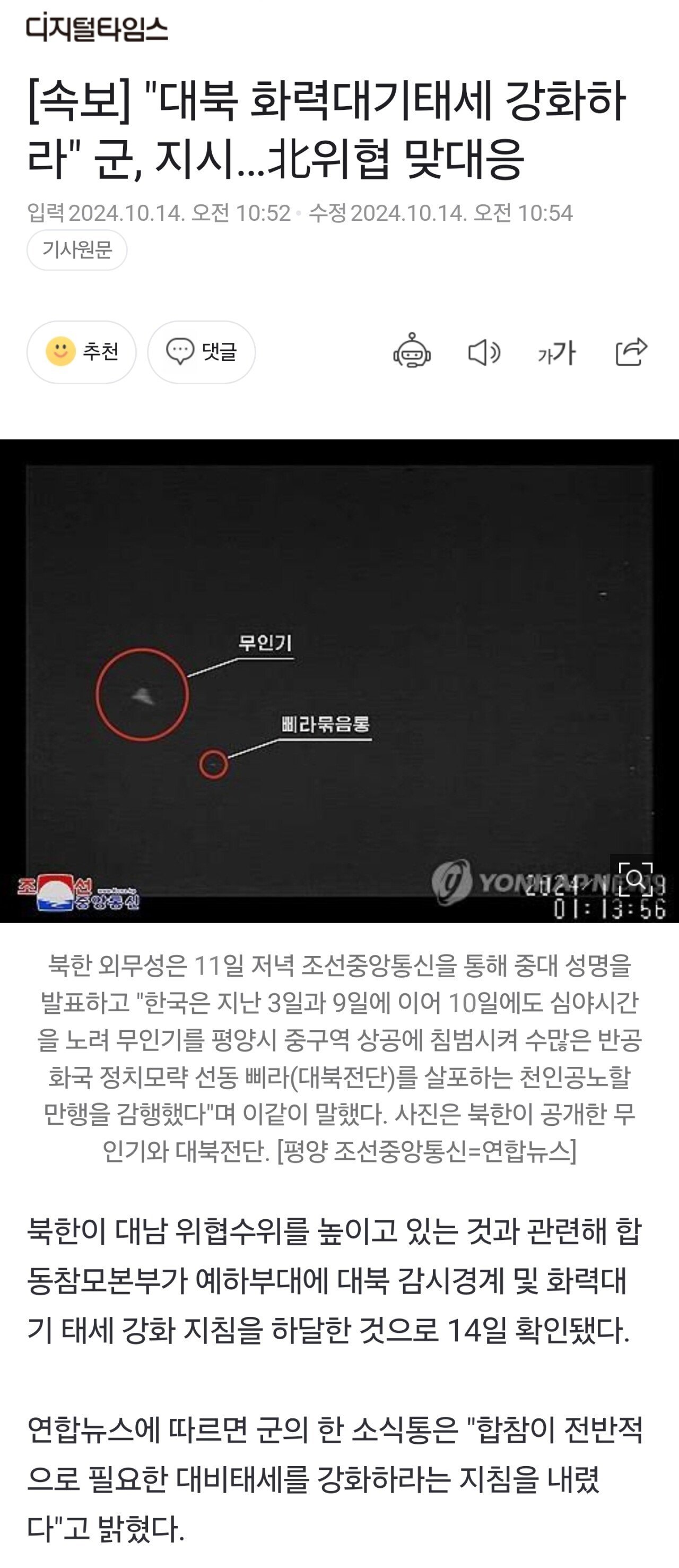 [속보] "대북 화력대기태세 강화하라" 군, 지시…北위협 맞대응