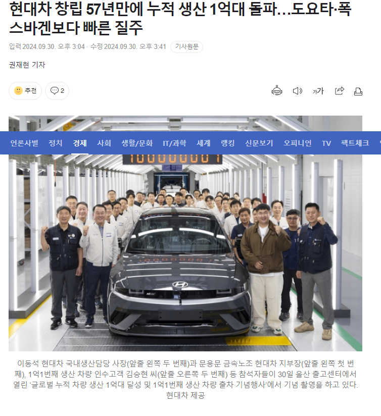 현대차 창립 57년만에 누적 생산 1억대 돌파 ㄷㄷ