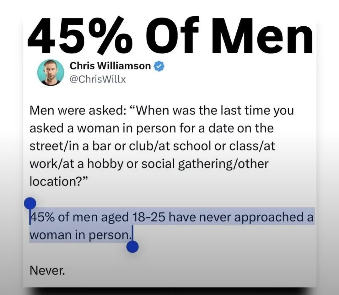 18-25세의 남자들 중 45%는 여성에게 직접 데이트 신청을 한 적이 없다.
