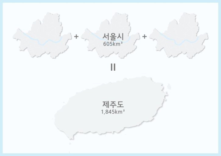 서울특별시+인천광역시+부천시+의정부시가 다 들어가고도 약간 남을 정도이며 부산광역시+울산광역시가 전부 들어가고도 남는 면적이므로 제주도는 결코 작은 섬이 아니다.