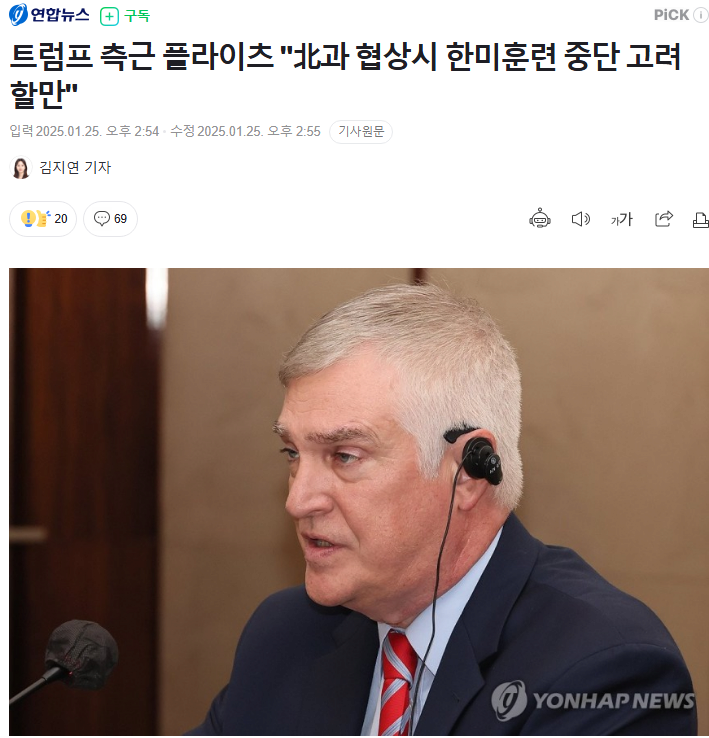 도널드 트럼프 미국 대통령의 측근 프레드 플라이츠 미국우선주의정책연구소(AFPI) 부소장이 북한과 협상 재개를 위해 한미연합훈련의 일시 중단을 고려해볼 만하다는 취지로 말했다고 미국 자유아시아방송(RFA)이 24일 보도했다.