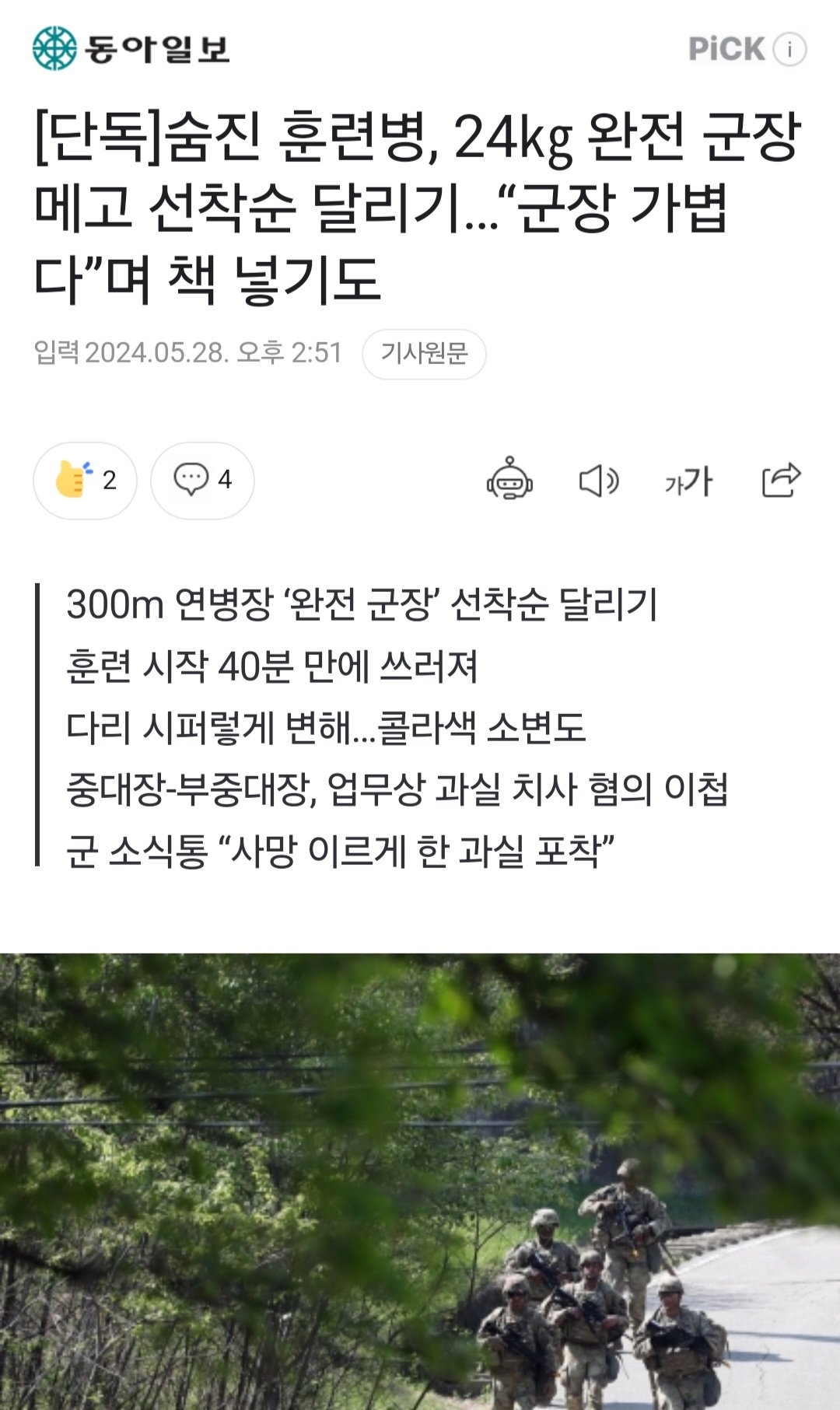 일명 ‘얼차려’로 불리는 군기 훈련을 받던 중 쓰러져 이틀 뒤 사망한 훈련병이 24kg 안팎 무게의 군장을 메고 연병장 내 ‘선착순 달리기’를 하는 등 가혹행위에 준하는 훈련을 받은 정황이 추가로 확인됐다. 훈련병이 든 군장 무게를 늘린다며 전투화 등으로 채워진 군장 빈 공간에 책 여러 권도 넣었다고 한다. 군 수사당국은 해당 부대 중대장(대위)과 부중대장(중위)에게 훈련병을 사망에 이르게 한 중대 과실이 있다고 보고 업무상 과실 치사 혐의를 적용해 민간 경찰로 사건을 28일 이첩했다.