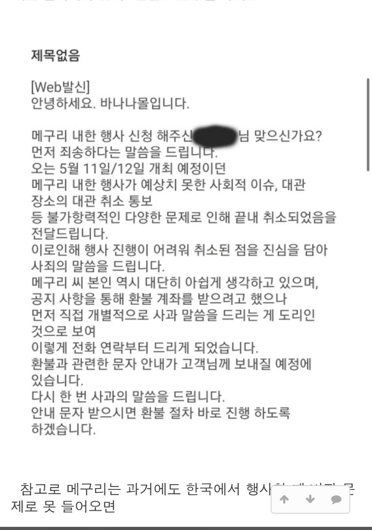 3. 바나나몰도 똑같이 행사 취소 됐지만 플레이조커와 대처 방식이 다름 플레이조커➡️사람들 환불 문의 무시하고 환불해주기 싫어서 질질 끌기, 취소 확정됐으면 최대한 빨리 팬들한테 알리고 사과하는게 맞는데 배우들한테만 알리고 그 다음날 되어서 팬들한테 공지함, 책임감이라곤 찾아 볼 수 없는 행동 바나나몰➡️바로 공지하고 환불 어떻게 해줄건지도 자세히 적어놓고 개별적으로 전화, 문자 돌려서 사과하고 환불관련해서 한 번 더 고지함,조커랑 상반되게 행사가 취소 됐어도 끝까지 책임지는 모습(바나나몰 편들려는게 아니라 이렇게 대처하는게 정상임..)
