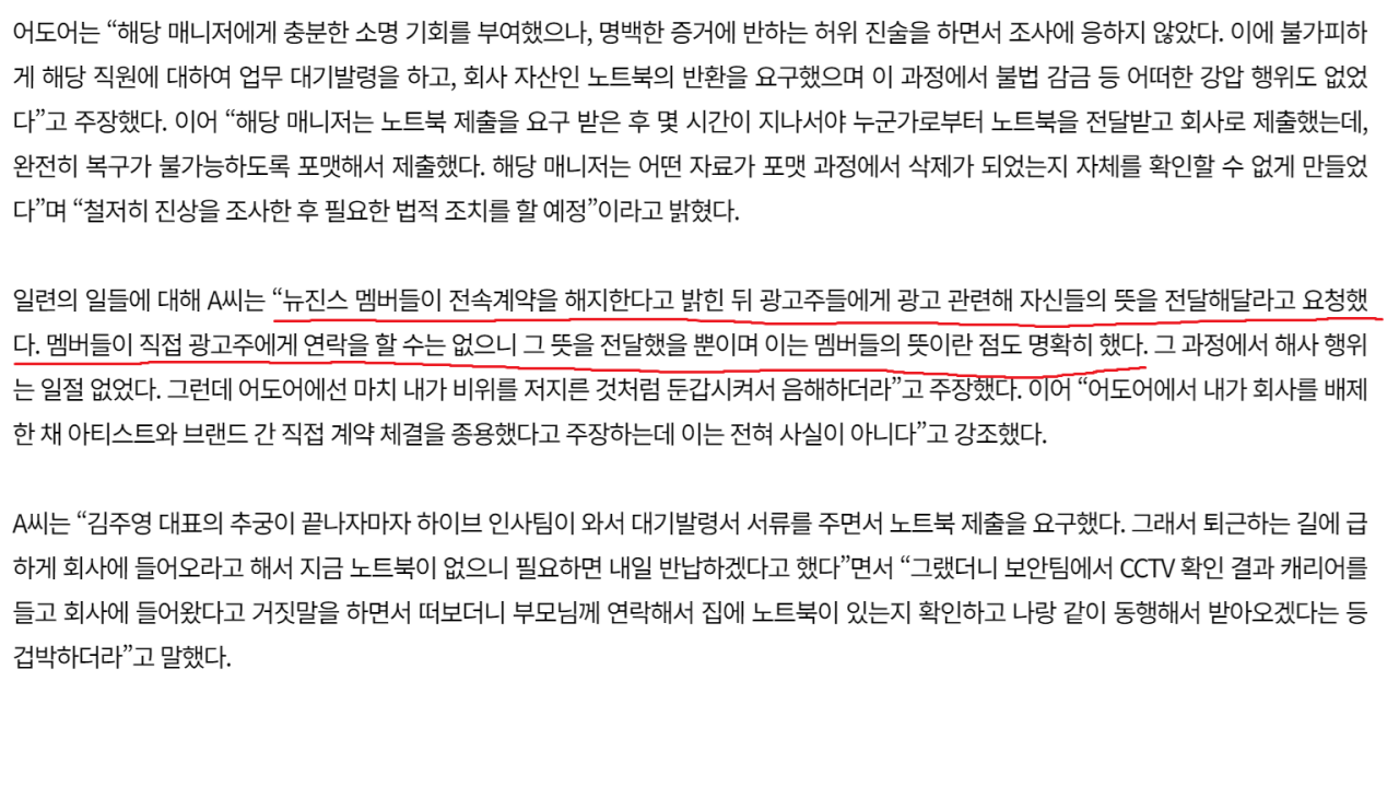 매니저가 어도어 통하지않고 광고주와 컨택한 것은 독단적인 행동이 아니라