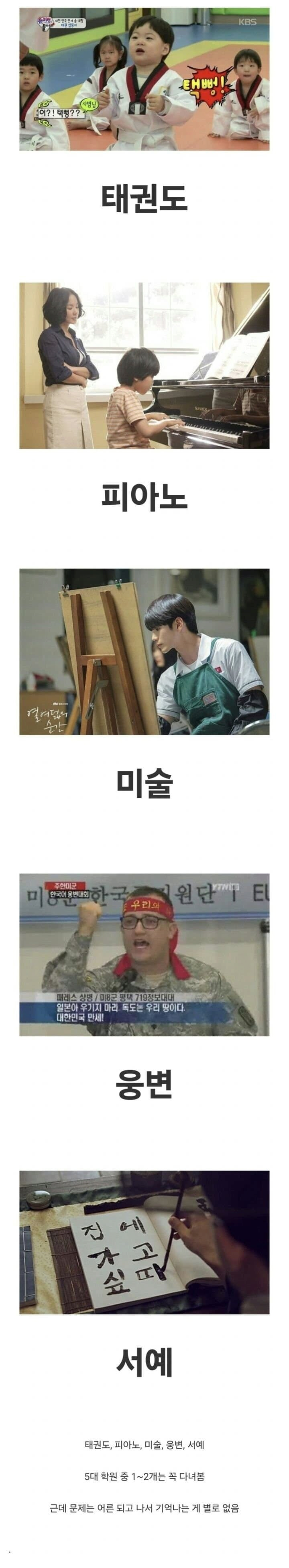 짧게라도 태권도,피아노,미술,웅변,서예 혹은 비슷한것들 다양하게 다녀 봄
