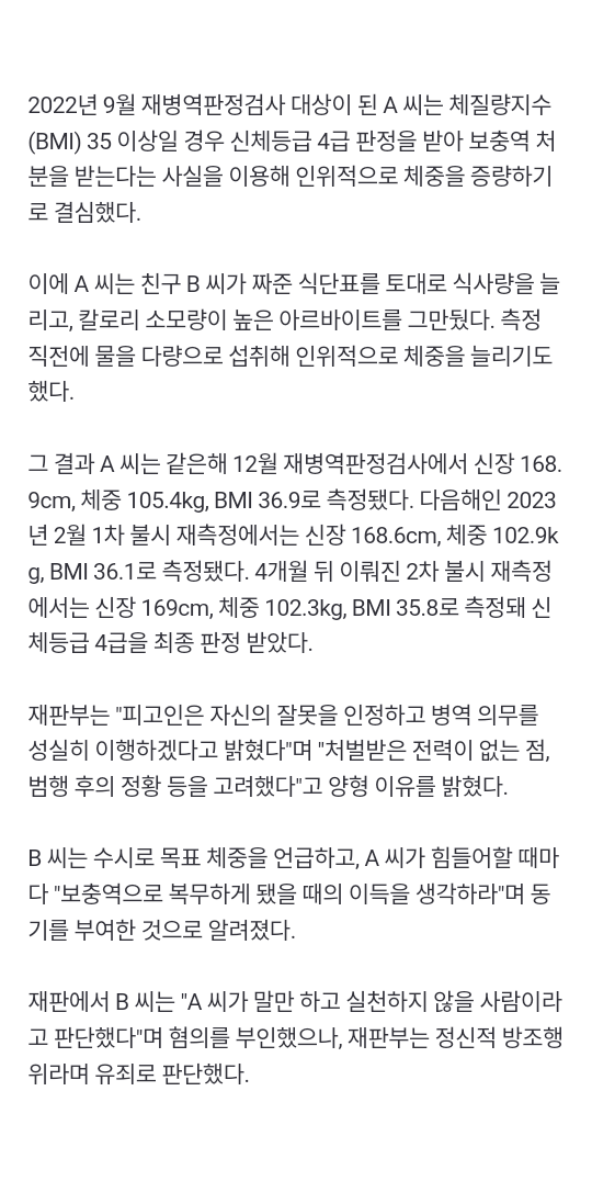 "군대 가기 싫어" 105kg까지 찌운 20대… 식단 도운 친구도 '유죄'