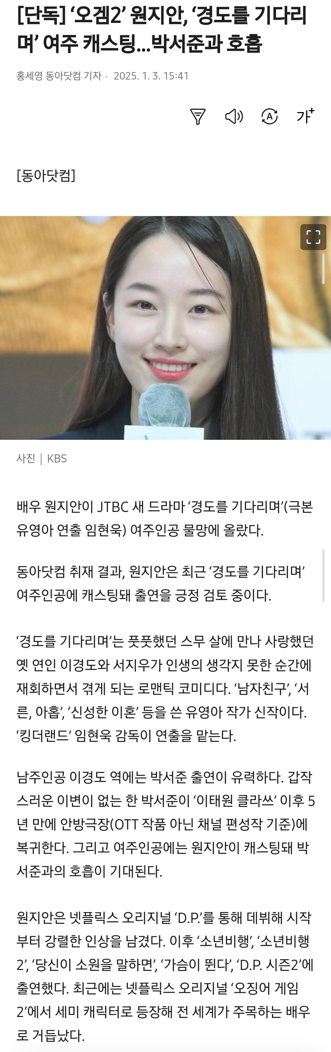 [단독] ‘오겜2’ 원지안, ‘경도를 기다리며’ 여주 캐스팅…박서준과 호흡