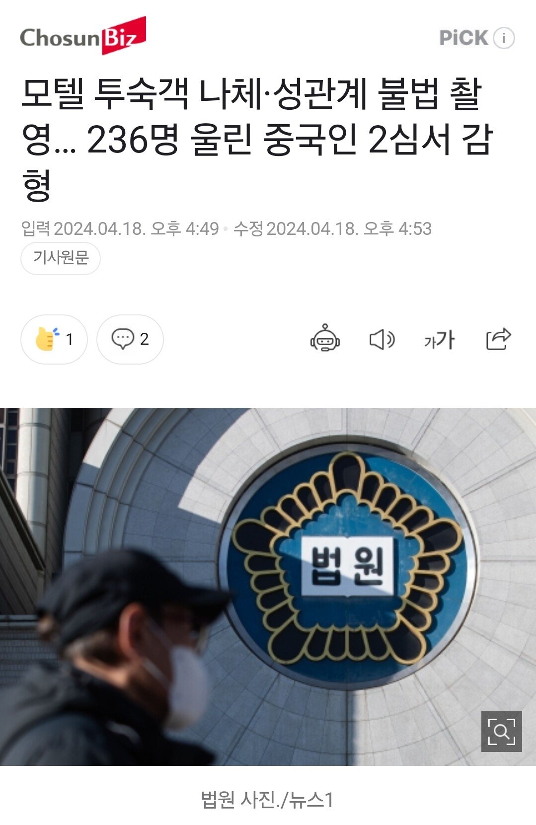 숙박업소에 불법 촬영 기기를 설치해 투숙객들을 몰래 촬영한 중국인이 2심에서 감형받았다.