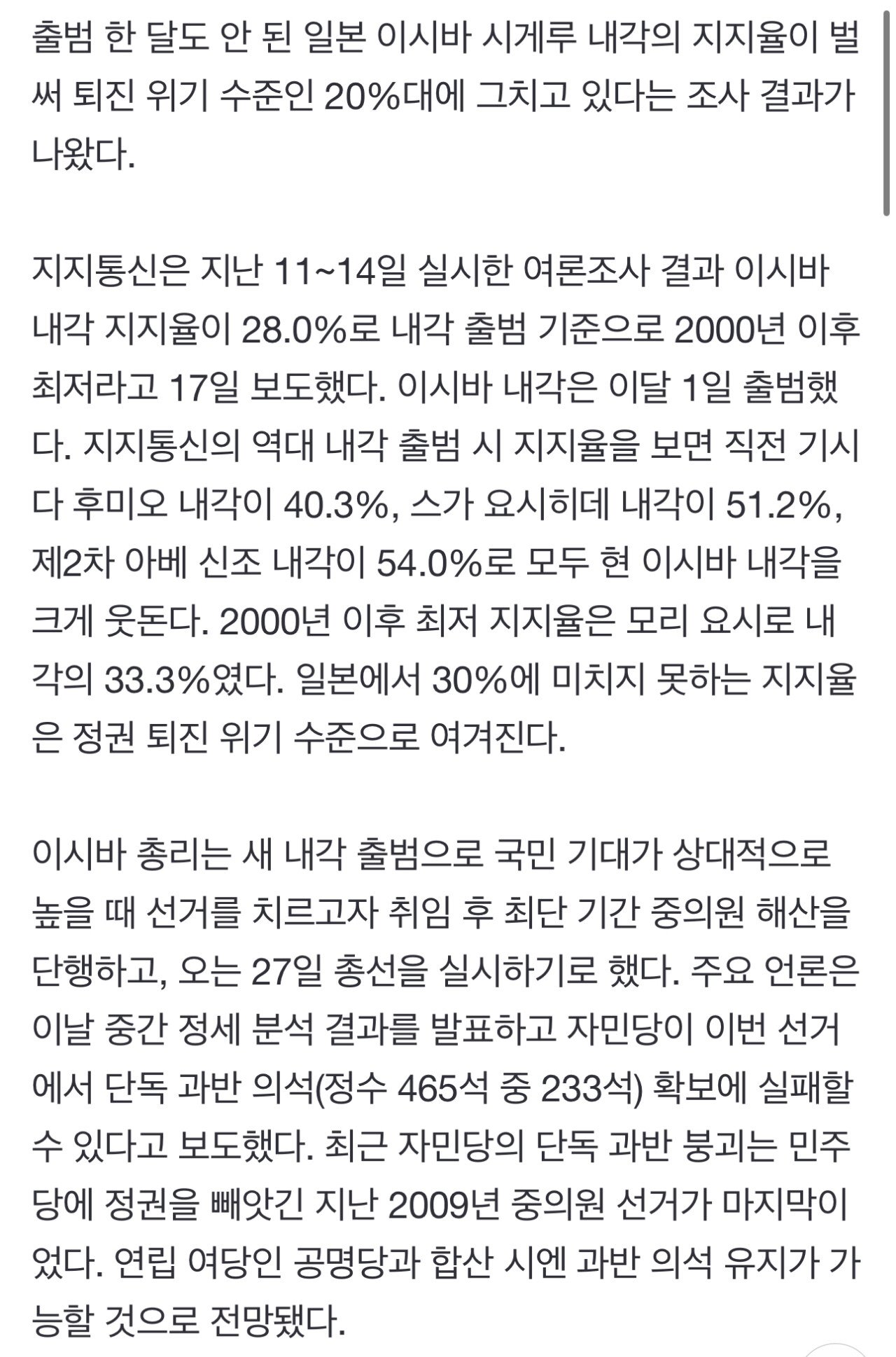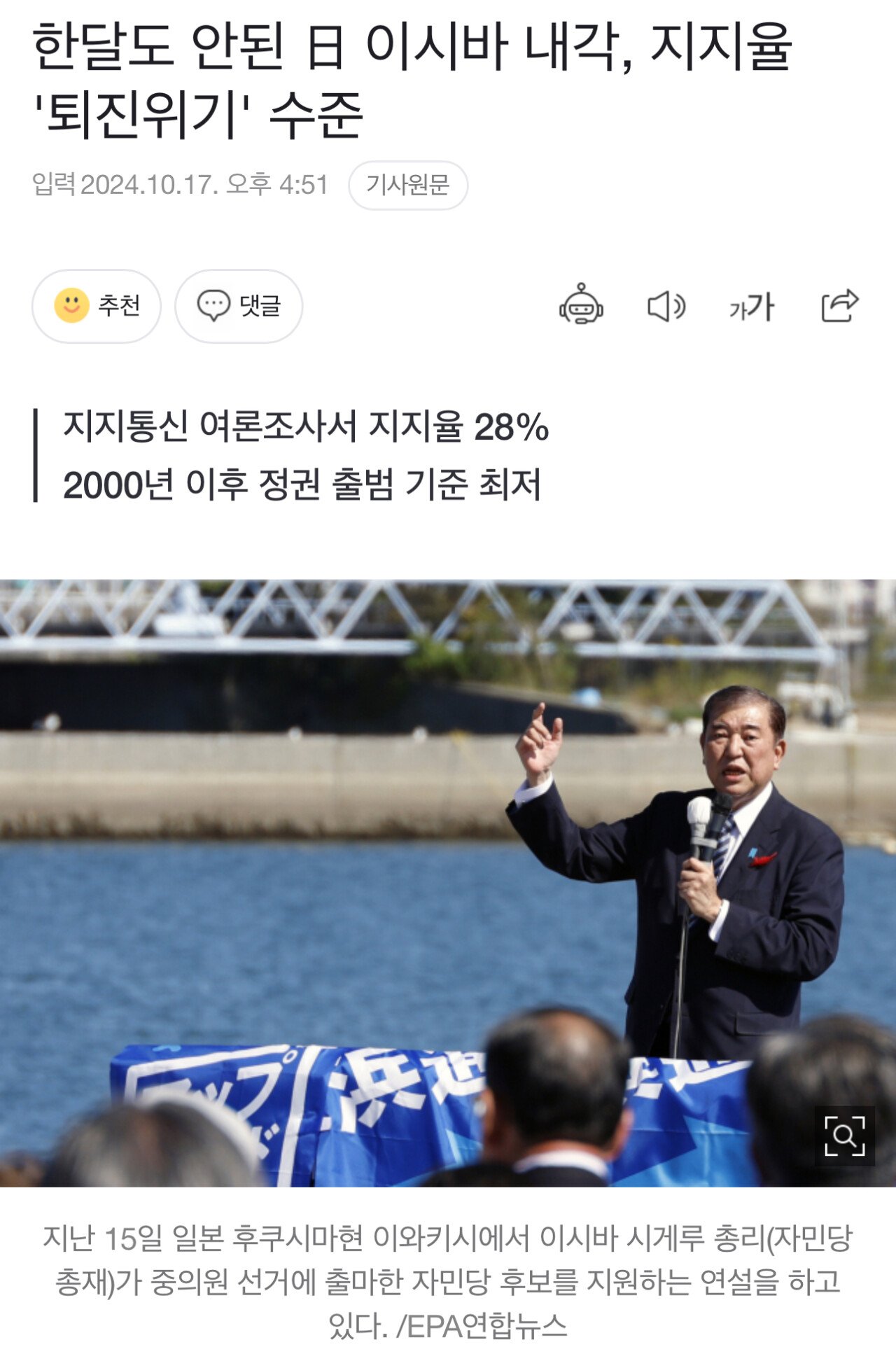 한달도 안된 日 이시바 내각, 지지율 '퇴진위기' 수준
