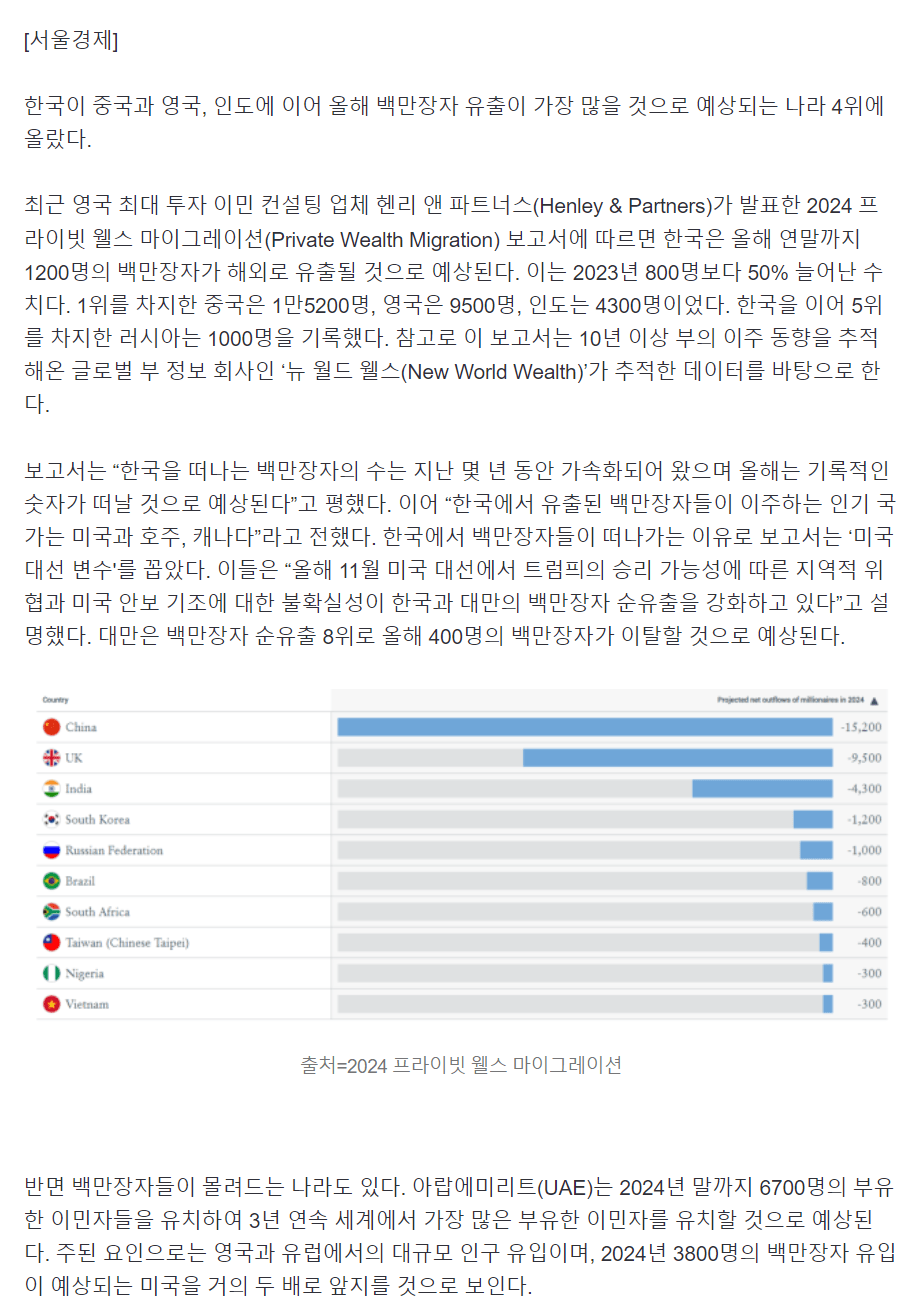 인구수 대비로 비교하면 중국보다 부자들이 더 탈출중