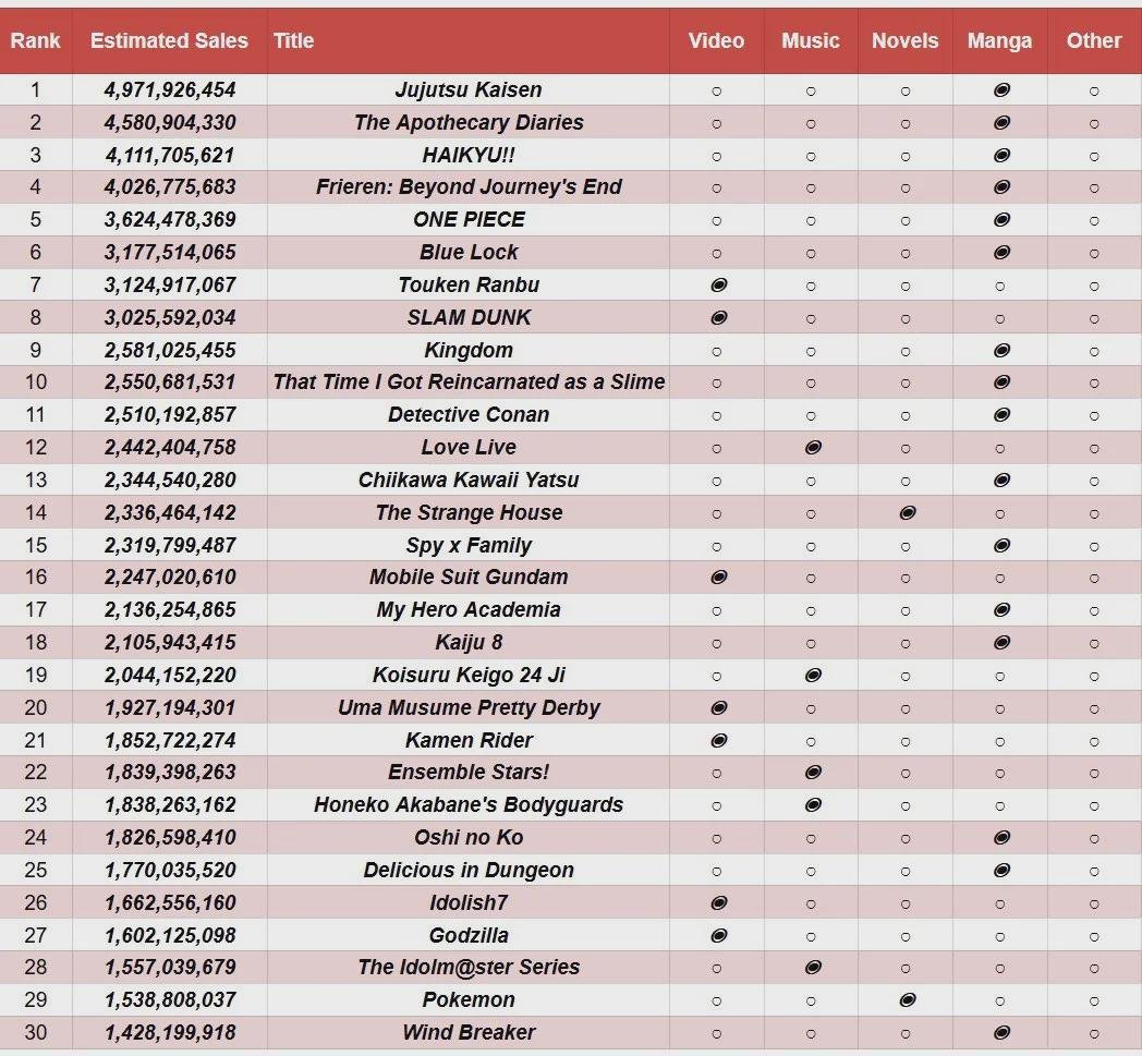 2024년 만화/소설/애니/영화 미디어 믹스 일본 총 매출 순위
