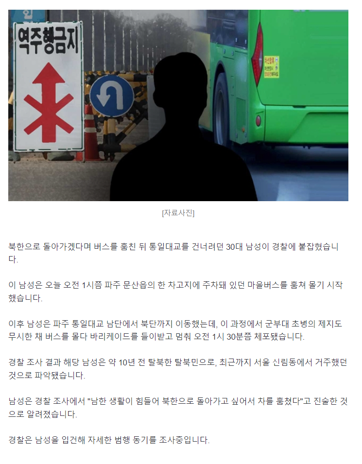 "북한 돌아가고 싶어서"..버스 훔친뒤 통일대교 건너려던 탈북민 체포