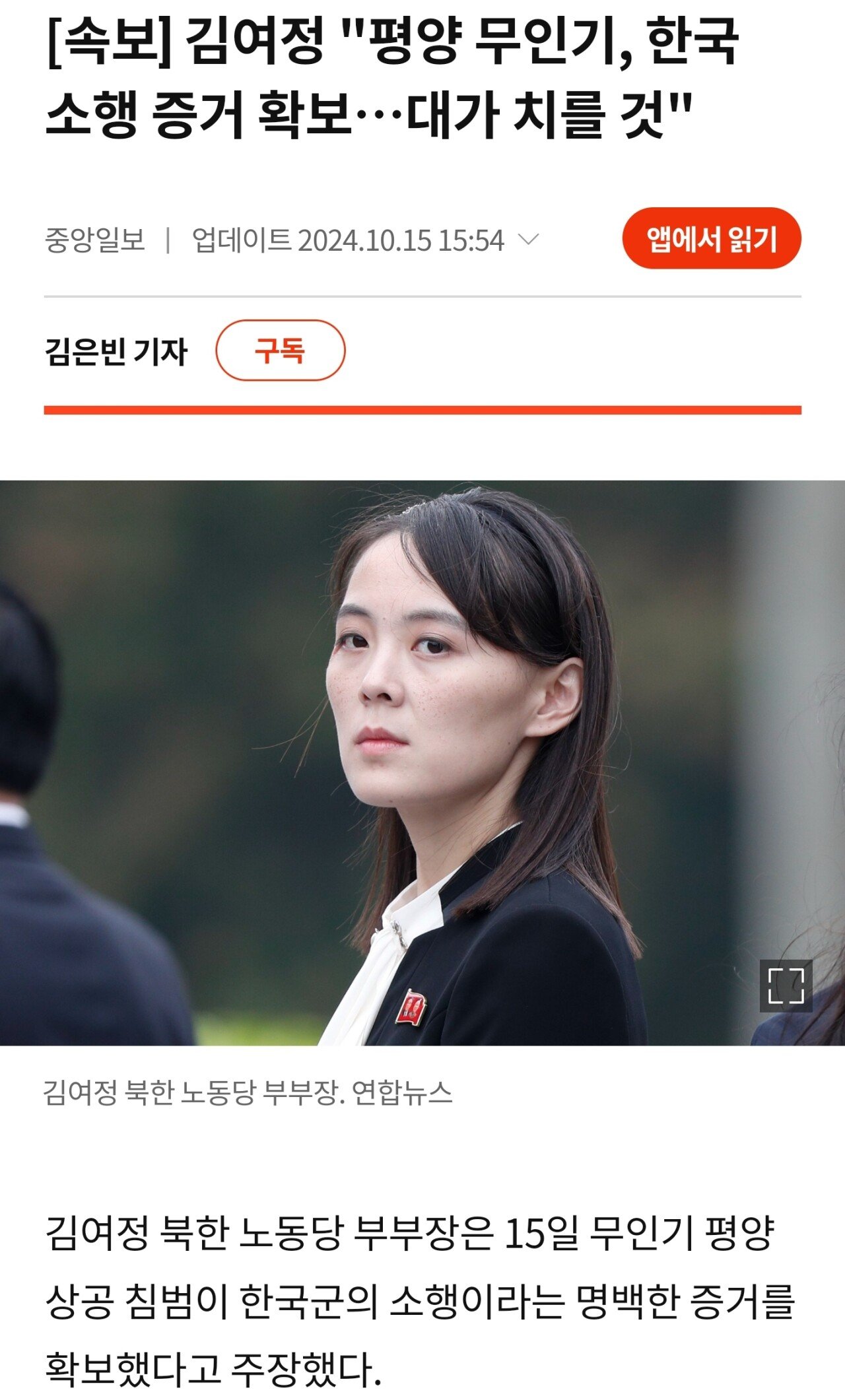 속보) 김여정 "평양 무인기, 한국 소행 증거 확보.대가 치를 것"
