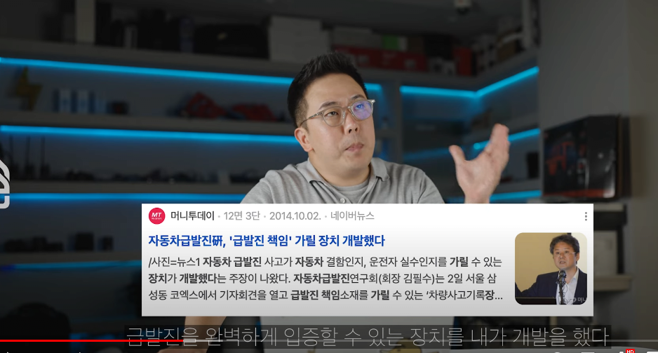 김필수 교수는 급발진을 가릴 장치 개발했다고 말하며 팔아서 돈벌 궁리하고있고