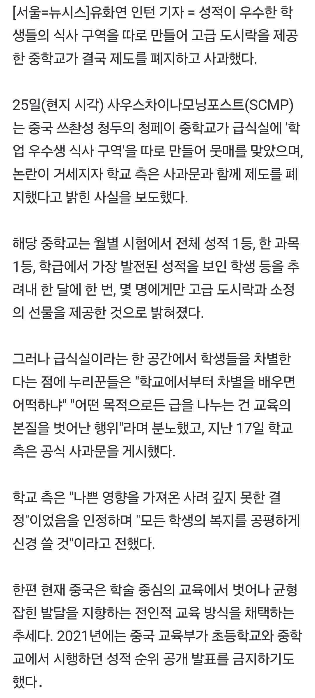 "성적 1등은 고급 반찬"…먹는 걸로 차별한 中 학교 결국 사과