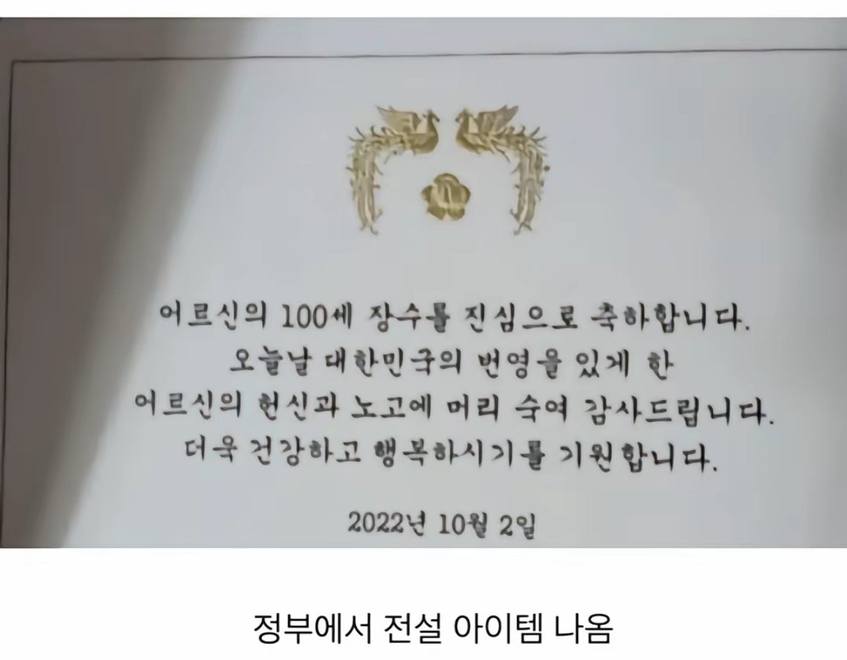 나이 100세 찍으면 정부에서 주는 물건 ㄷㄷㄷㄷㄷㄷ