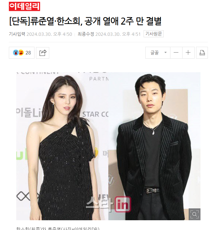 [단독]류준열·한소희, 공개 열애 2주 만 결별