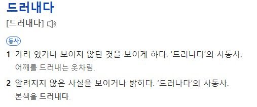 기본형인 '드러나다' 도 '들어나다' 로 많이 틀리는데, 들어나다는 아예 없는 단어임