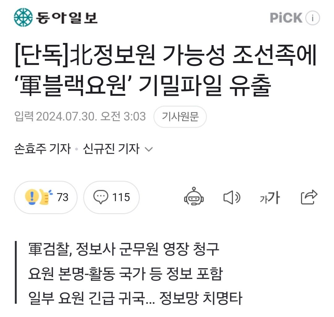 이날 방첩사 고위 관계자 및 야당 관계자 등에 따르면 국군 정보사에서 근무하는 군무원 A 씨는 중국 등 해외에서 활동 중인 블랙요원 리스트와 전체 부대원 현황 등 2, 3급 기밀 여러 건을 출력하고, 파일 형태로 중국동포에게 전송한 혐의를 받고 있다. 해당 파일엔 블랙요원의 본명과 활동 국가 등 세부 정보가 포함된 것으로 알려졌다.