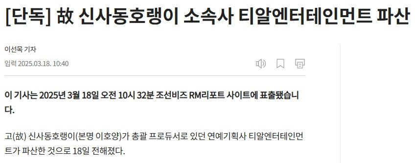 [단독] 故 신사동호랭이 소속사 티알엔터테인먼트 파산