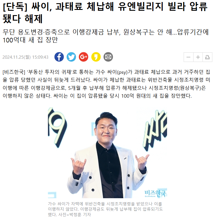 [단독] 싸이, 과태료 체납해 유엔빌리지 빌라 압류됐다 해제