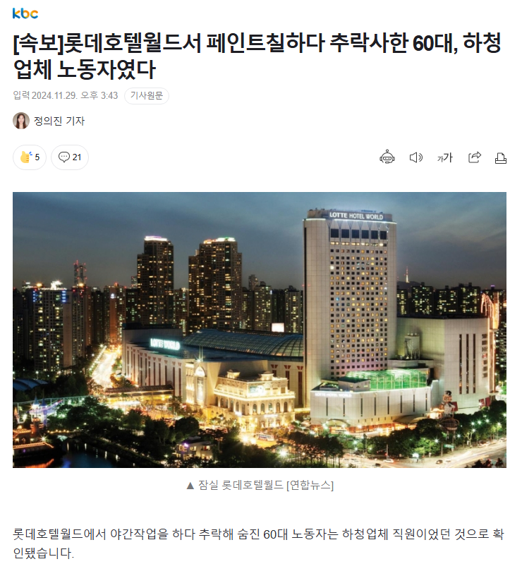 [속보] 롯데호텔월드서 페인트칠하다 추락사한 60대, 하청업체 노동자였다