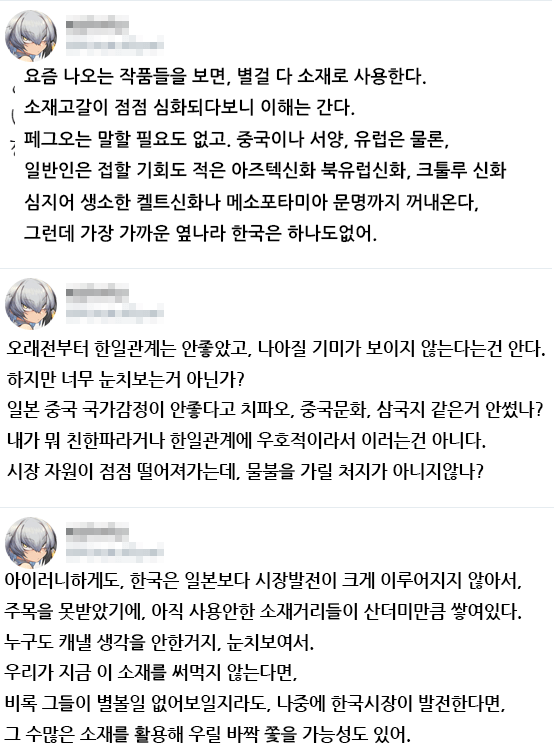 일본인: 창작물에 한국 관련 소재를 안 쓰는 이유가 뭐야?