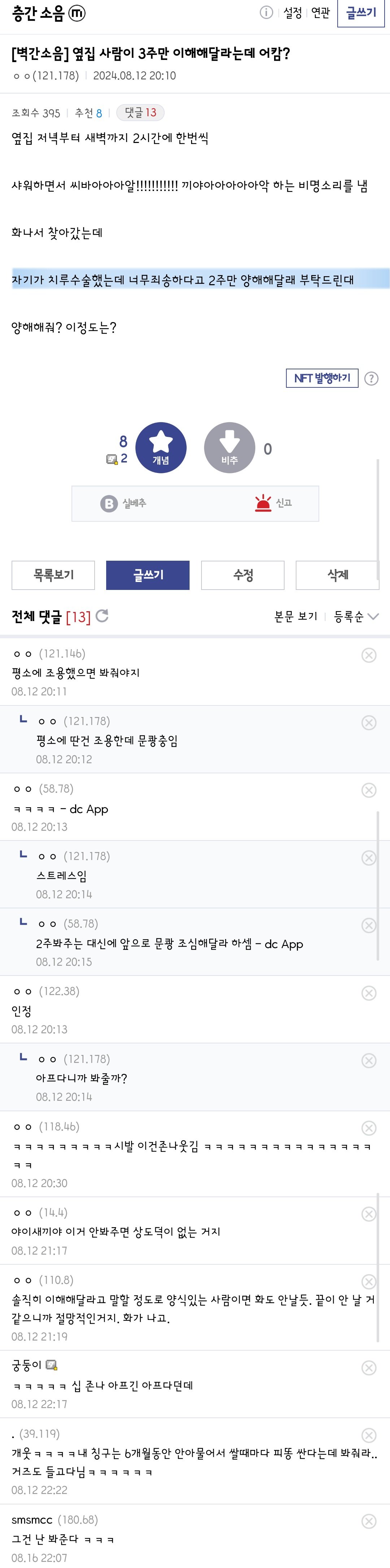 옆집 벽간소음 이런건 봐줘야 하냐는 디씨인 ㅋㅋㅋㅋ