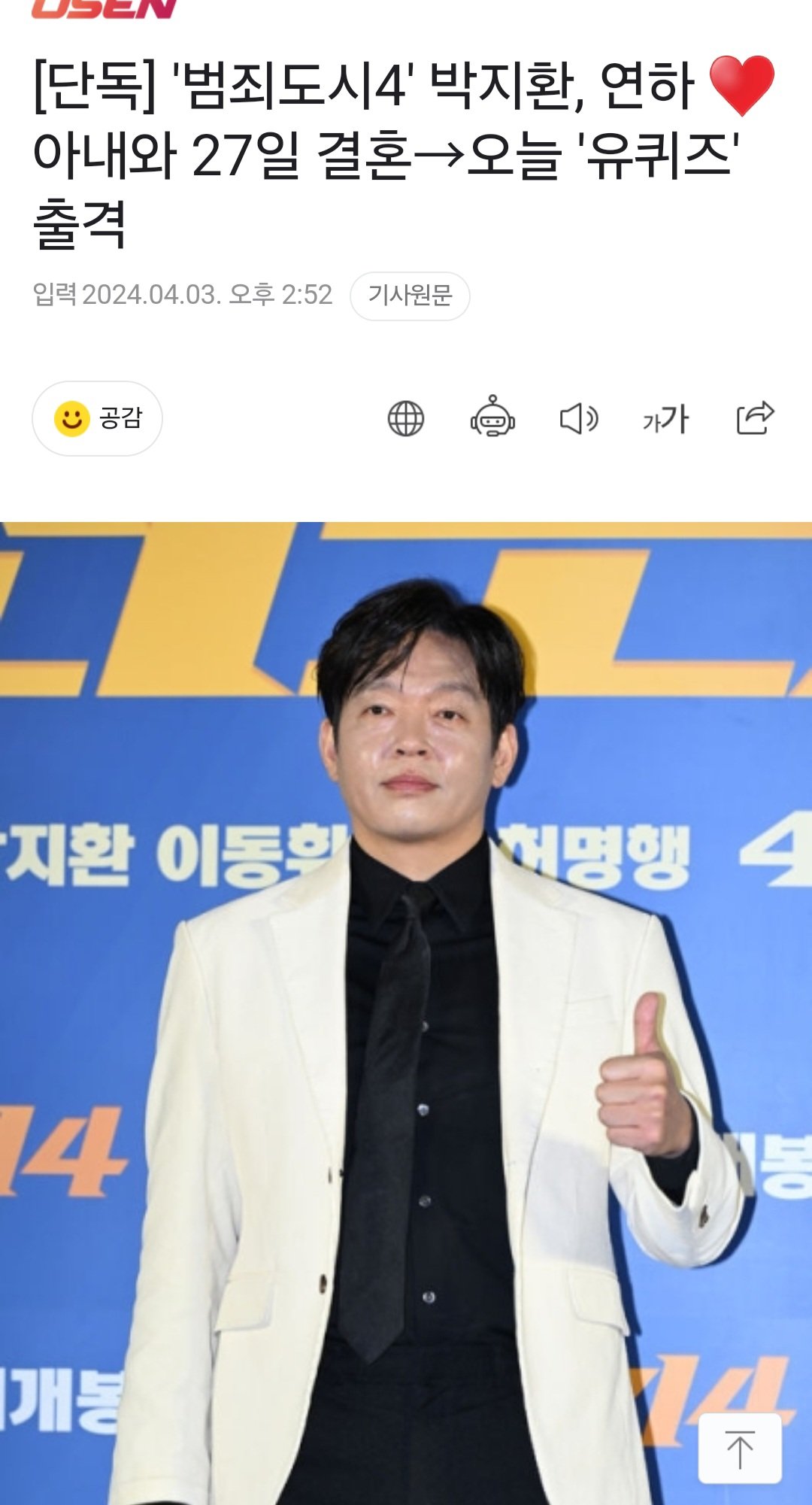 영화 '범죄도시' 시리즈의 장이수 캐릭터로 큰 사랑을 받은 박지환이 4월 27일 미모의 아내와 결혼식을 올리고, '유 퀴즈 온 더 블럭'(이하 유퀴즈) 출연도 확정했다.