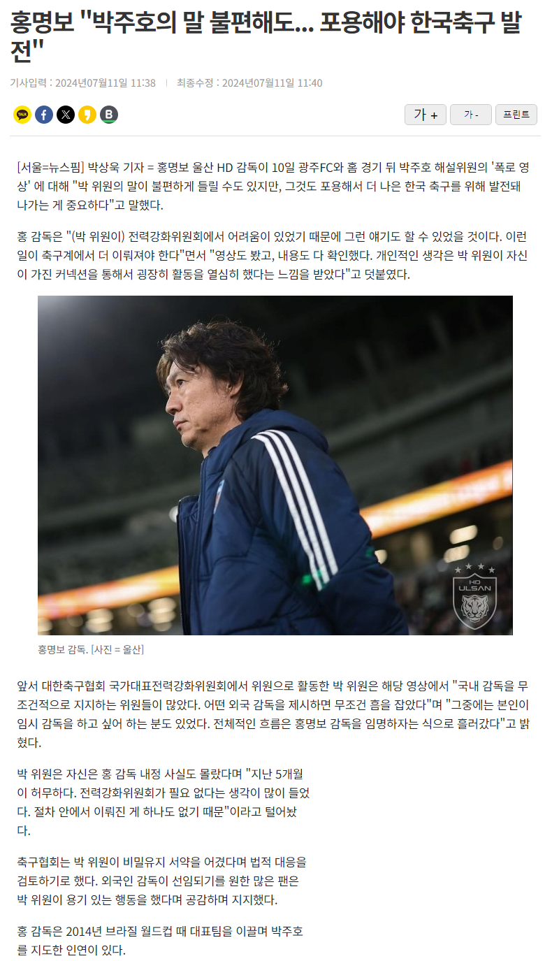 홍명보 "박주호의 말 불편해도... 포용해야 한국축구 발전"