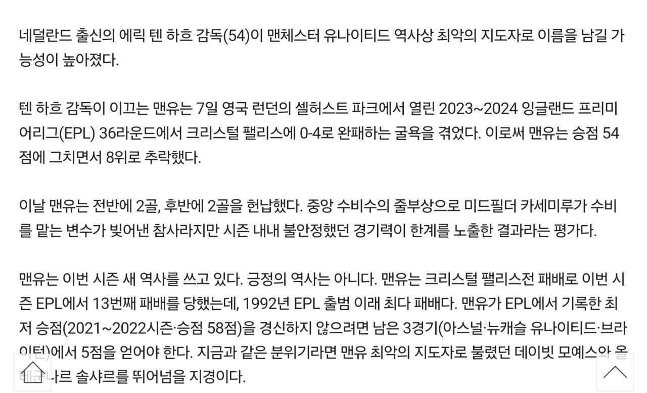 [뉴스] 맨유 역사상 최악의 감독 위기의 텐하흐