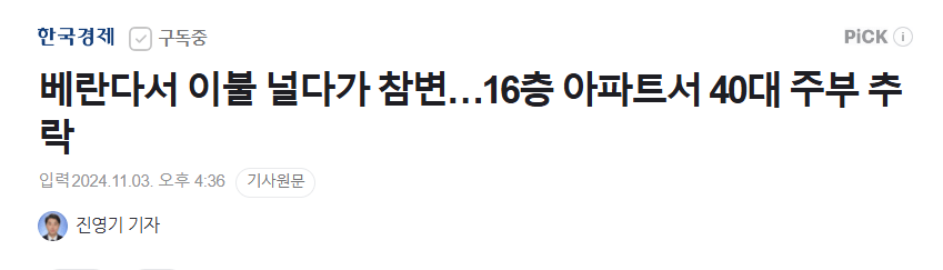 베란다서 이불 널다가 참변…16층 아파트서 40대 주부 추락