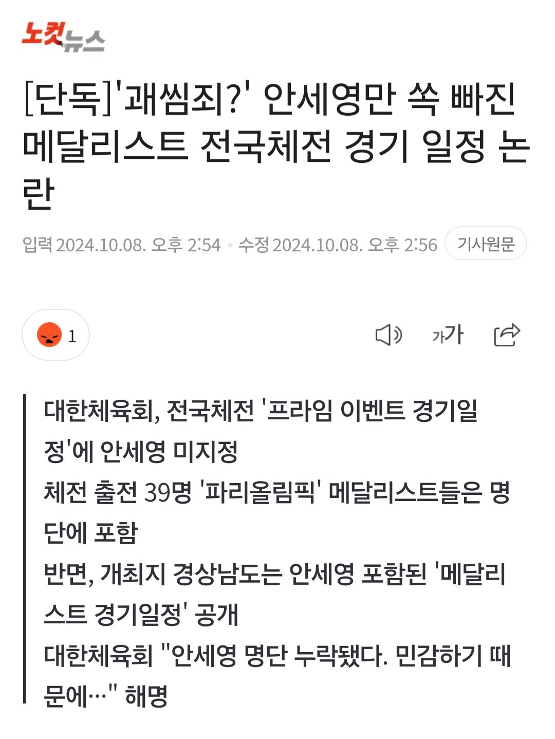 '제105회 전국체육대회(전국체전)' 배드민턴 종목에 출전하는 안세영(삼성생명)이 대한체육회가 제작한 '종목별 프라임 이벤트(Prime Event)'에 지정(명단에 미포함)되지 않은 것으로 드러나 논란이다. 대한체육회는 전국체전의 붐업 조성을 위해 '프라임 이벤트'를 통해 국가대표 선수 또는 국제 대회에서 우수한 성적을 거둔 선수가 참가하는 경기, 다관왕 신기록 예상 경기, 전년도 전국체전 수상자 참가 경기 등을 지정, 해당 선수들의 일정을 사전 홍보 및 안내하고 있다. 8일 CBS노컷뉴스의 취재를 종합하면 대한체육회는 지난 4일 홈페이지에 '제105회 전국체육대회 프라임 이벤트(Prime Event) 경기일정 알림' 이란 제목의 문건을 공지했다. pdf 파일로 작성된 이 문건에는 이번 체전에 출전하는 '2024 파리올림픽' 메달리스트 40명의 경기일정이 상세하게 명시돼 있으나 안세영은 빠져있다.