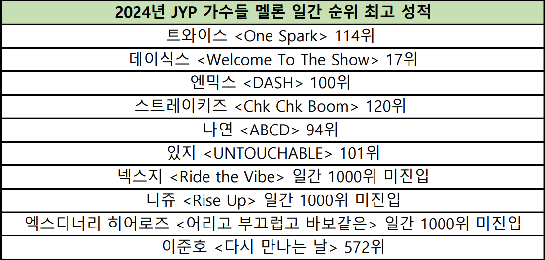 올해 JYP가수들 음원 성적 근황 jpg