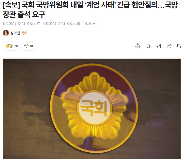 [속보] 국회 국방위원회 내일 ‘계엄 사태’ 긴급 현안질의…국방장관 출석 요구