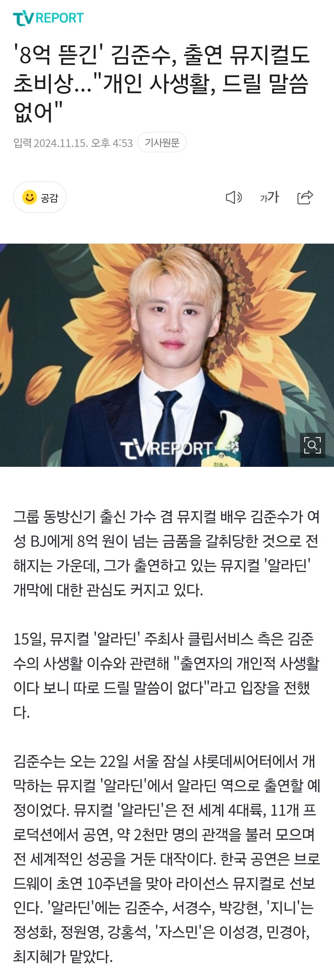 '8억 뜯긴' 김준수, 출연 뮤지컬도 초비상..."개인 사생활, 드릴 말씀 없어"