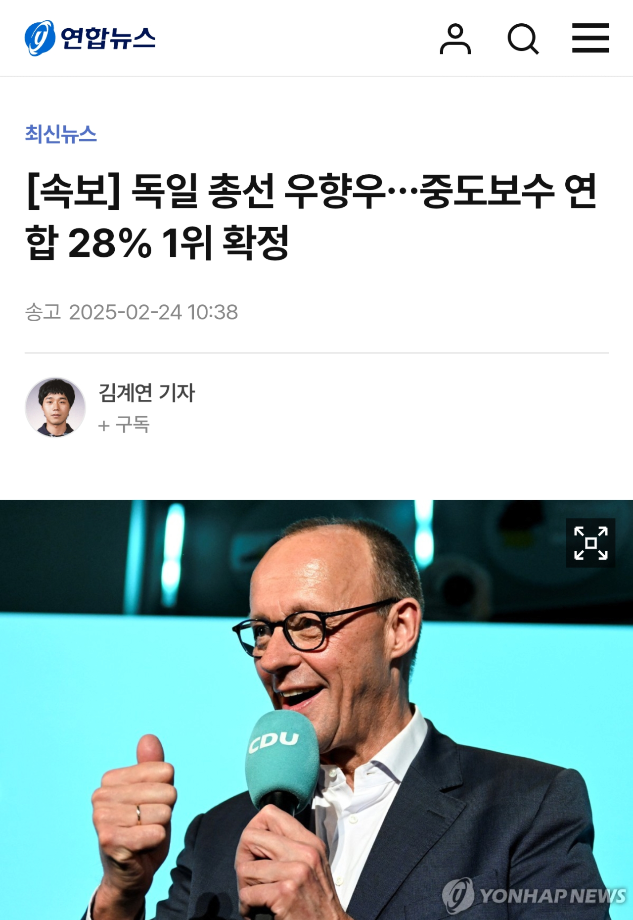 [속보] 독일 총선 중도보수 연합 28% 1위 확정
