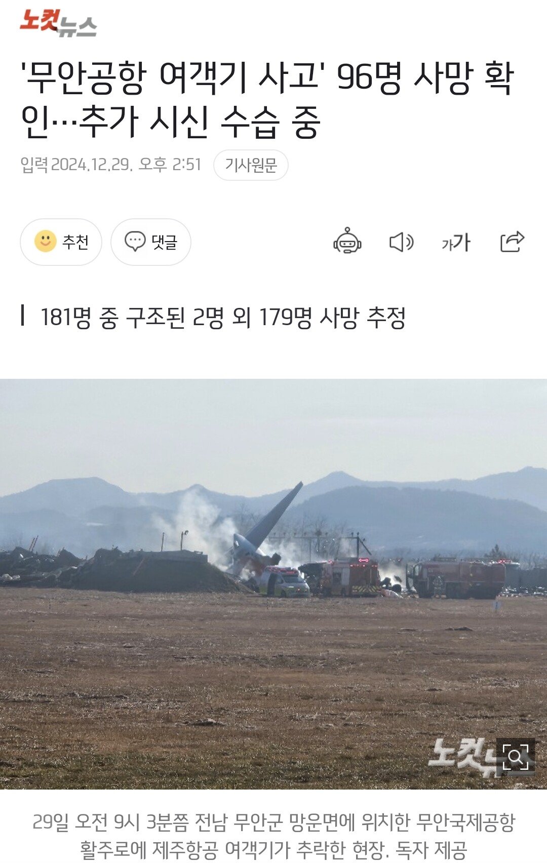 속보) 항공기 꼬리 칸 제외 형체 식별도 불가능