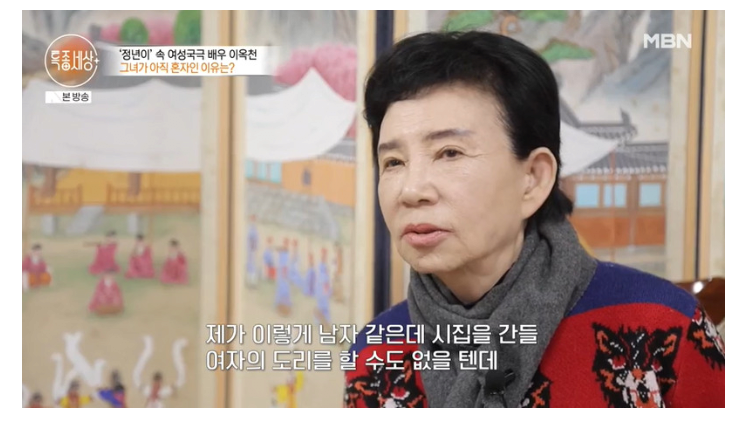78세의 나이에 결혼을 하지 않은 이옥천은 "결혼 두 번이나 한 사람이다. 하나는 판소리, 둘째는 각시이자 애첩이 여성국극이다"고 너스레를 떨었다.그러면서 이옥천은 "제가 이렇게 남자 같은데 시집을 간들 여자의 도리를 할 수도 없을 텐데. 후회도 없고 (결혼해서) 살면 아기자기한 재미도 있었겠지만 그런 생각은 안 하고 '내 공부만 해야겠다' 다짐했다"고 본인의 확고한 생각을 드러냈다.