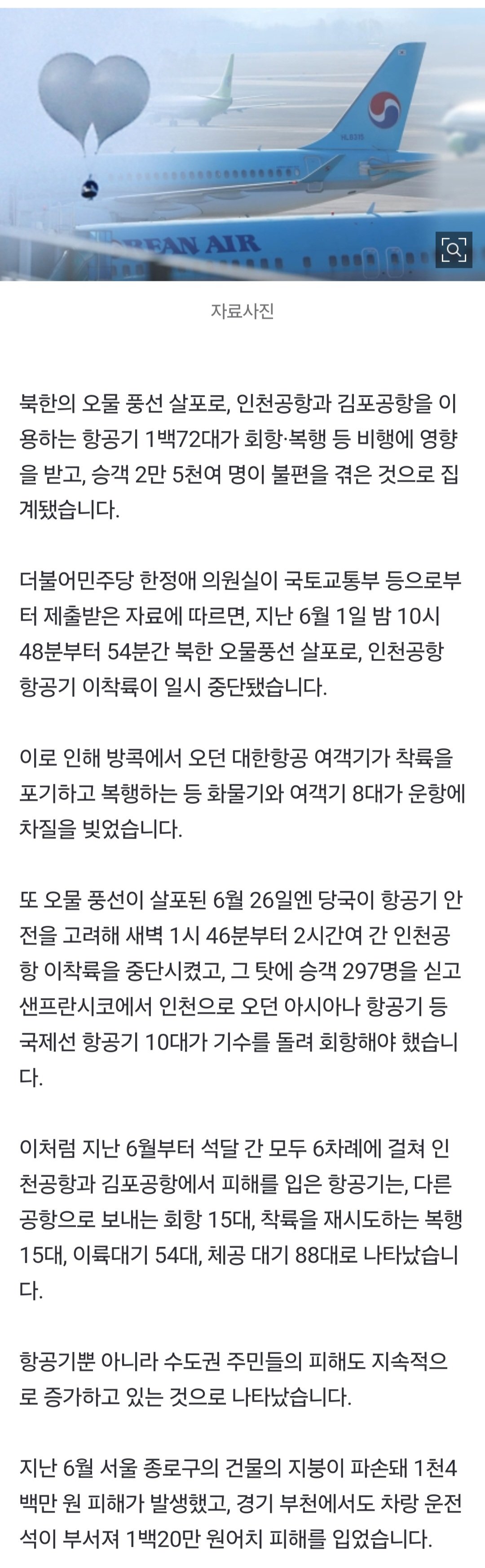 [단독] 북한 오물풍선에 항공기 172대 영향 승객 2만 5천 명 불편
