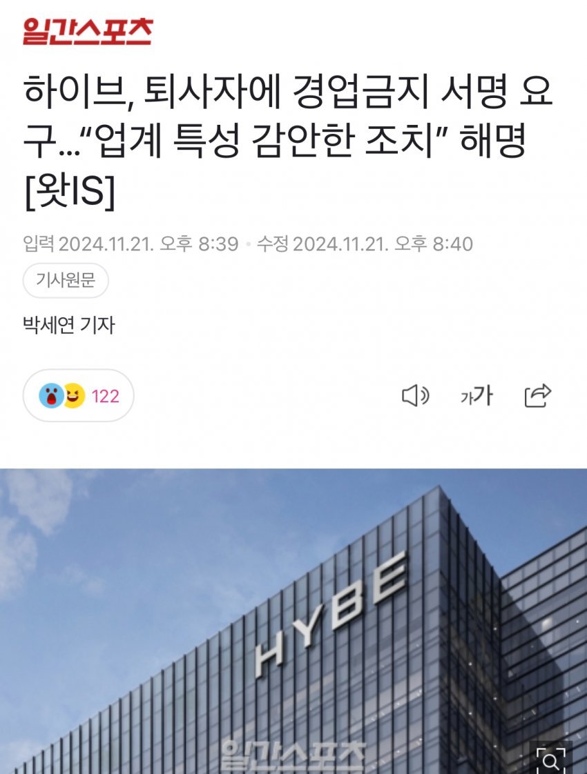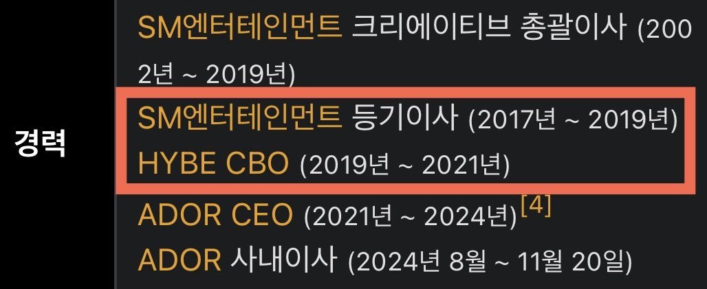 일반 직원도 퇴사하면 1년 동안 강제 경력단절 시킬 정도로 업계 특성이 그렇지만, 본인들은 민희진은 스엠 퇴사하자마자 헤드헌터 시켜서 바로 데려와서 CBO로 감투 씌어줌 ㅋㅋㅋㅋ