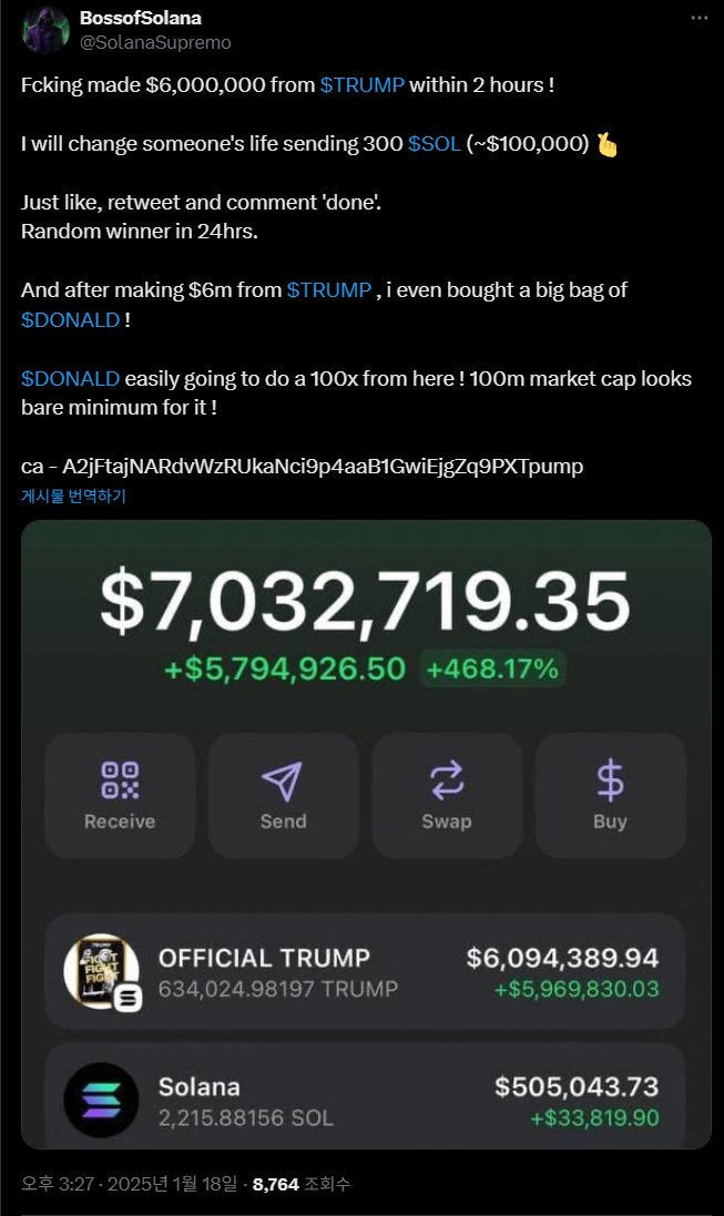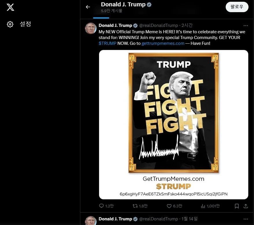 오늘 갑자기 트럼프 공식 트위터 계정에서 트럼프 밈코인을 만들었다고 올라옴